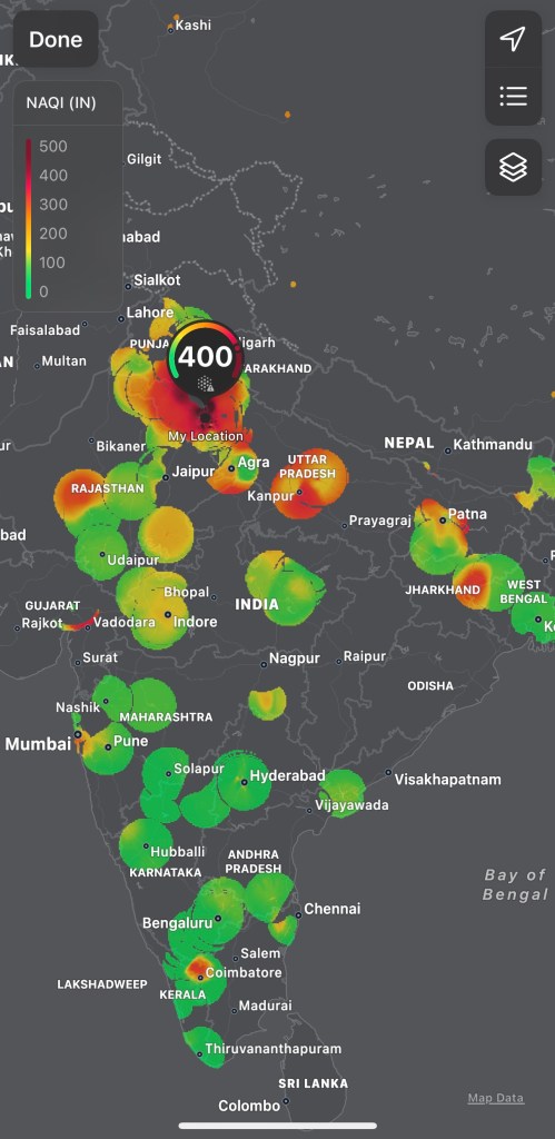 Descending into Delhi, the one thing you cannot help but notice at this time of year is the transition into the pollution. At around 5,000 or so feet there is a visible haze layer that you descend into leaving the clear skies behind.