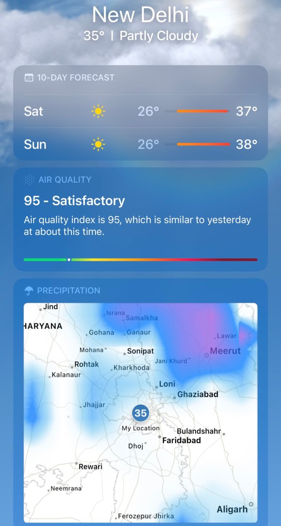 The last week here in Delhi has been relatively calm, and next week looks to be the same. I took the chance to work from home today, which also gave me an opportunity to see Sushmi my cleaner for the first time in a while. She does not speak much English as I have said in previous posts, but she knows enough to be able to complain – in a very exaggerated manner – about all the dust and dirt that keeps settling on the patio!